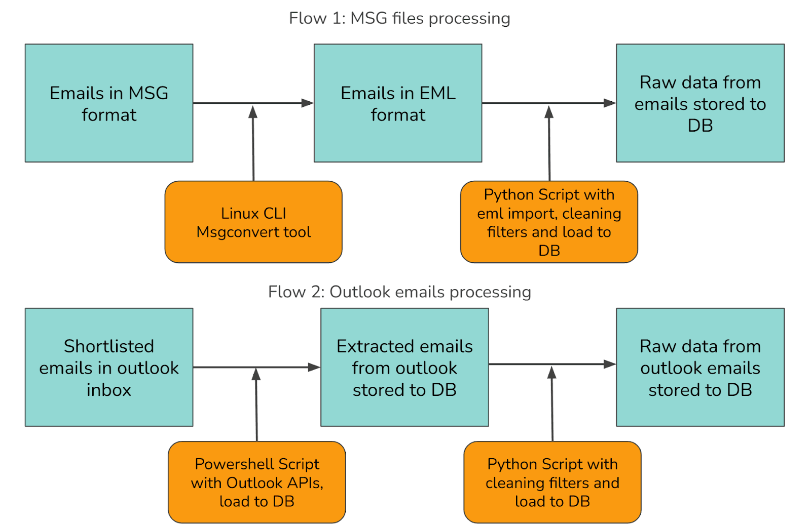 Our approach to processing the email data required handling two distinct sources through separate workflows, as illustrated below: