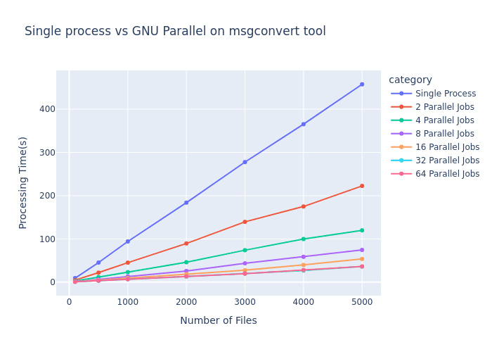 To demonstrate the real-world impact of parallel processing, we conducted benchmarks using GNU Parallel with the msgconvert tool across varying workloads and parallelism levels.